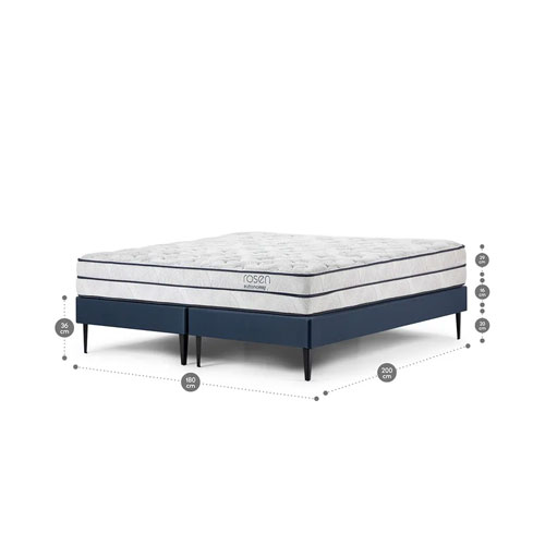 Tiene un Topper de espuma soft que otorga una resiliencia suave. Su cubierta superior es de tela tejido punto de origen belga de altísima calidad. Su base es de estructura de madera con tela Jacquard (sin acolchado) de color azul, y su cubierta superior tiene tela antideslizante que evita el desplazamiento del colchón. Las patas metálicas o de madera le otorgan gran estabilidad, firmeza y un atractivo look.