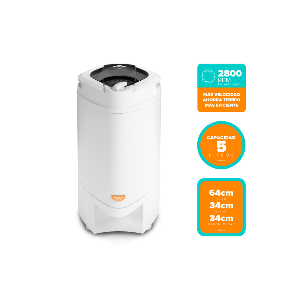 Centrífuga Mademsa 5Kg Carga Superior con Boquilla Antiderrame Primma 5N Blanca La centrífuga de ropa Mademsa PRIMMA 5N optimiza tu tiempo y ofrece la solución perfecta para hacer tu día a día más práctico, dejando tu ropa casi lista para usar. La centrífuga de 2800 RPM te proporciona una alta velocidad de rotación que permite una extracción más eficiente del agua de la ropa. De esta manera, tendrás tus prendas listas para usar en menos tiempo, optimizando tu rutina diaria. La aceleración progresiva del motor asegura un arranque suave, garantizando la estabilidad de la centrifugadora durante todo el proceso. Cuenta con una capacidad óptima que permite soportar hasta 5 kg de ropa en una sola vez. El diseño del tambor en acero inoxidable combina durabilidad y estilo, perfecto para tu lavadero. La tapa se bloquea durante el funcionamiento para evitar su apertura. Con el fin de brindar una mayor seguridad, solo podrás abrirla después de que el tambor deje de girar al finalizar el proceso de centrifugado. La boquilla antiderrame es una característica que te brinda mayor facilidad al momento de descargar el agua extraída. Su diseño inteligente canaliza el flujo de agua directamente hacia el recipiente, evitando salpicaduras no deseadas en otras direcciones. Además, también contribuye a la economía de recursos al permitir la reutilización del agua extraída para otros fines. Equipada con manillas que permiten moverla según tus necesidades. Sus manillas están estratégicamente ubicadas y permiten moverla de manera sencilla y segura, lo que facilita su instalación y uso. Garantizando funcionalidad y seguridad, la centrífuga de ropa Mademsa PRIMMA 5N cuenta con tres patas hechas de goma en la base del recipiente. Estas patas antideslizantes aseguran una sujeción óptima al piso, proporcionando mayor estabilidad.