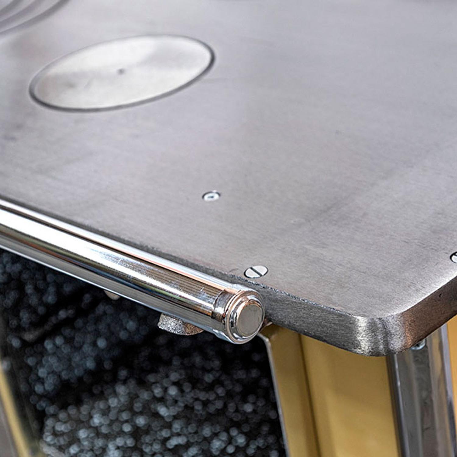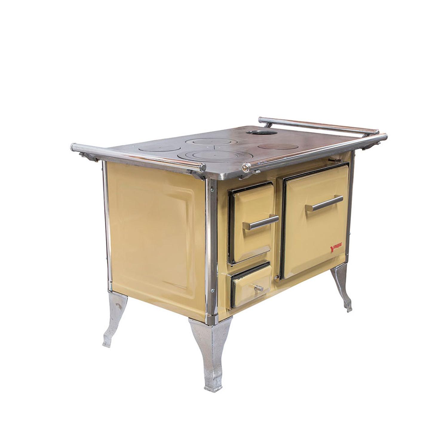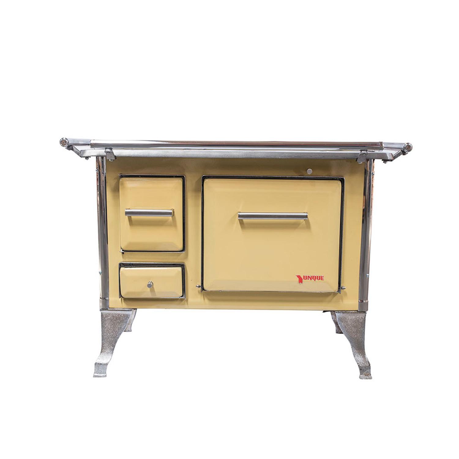 Cocina a leña, enlozada, con finas terminaciones cromadas sus manillas estilo tradicional, cuenta con baranda, marcos y amplio horno enlozado.