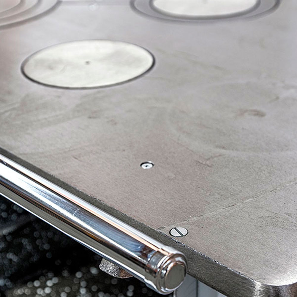 Cocina a leña, enlozada, con finas terminaciones cromadas sus manillas estilo tradicional, cuenta con baranda, marcos y amplio horno enlozado.