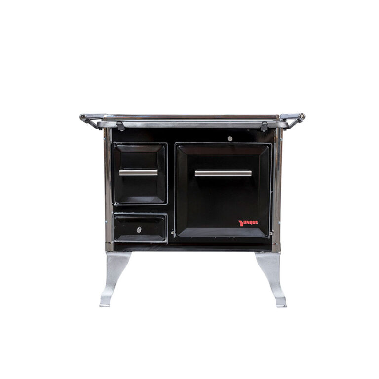 Cocina a leña, enlozada, amplio horno enlozado, cubierta desmontable, manillas tradicionales y baranda cromadas.