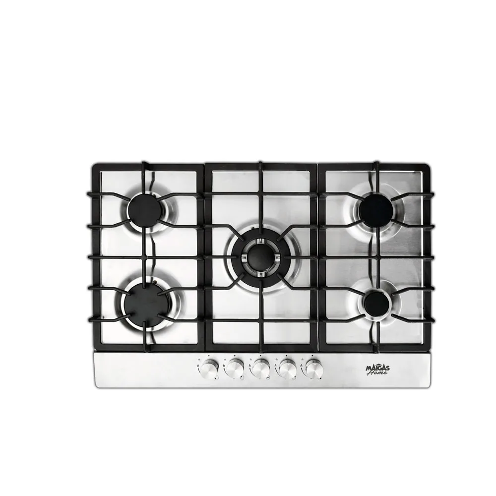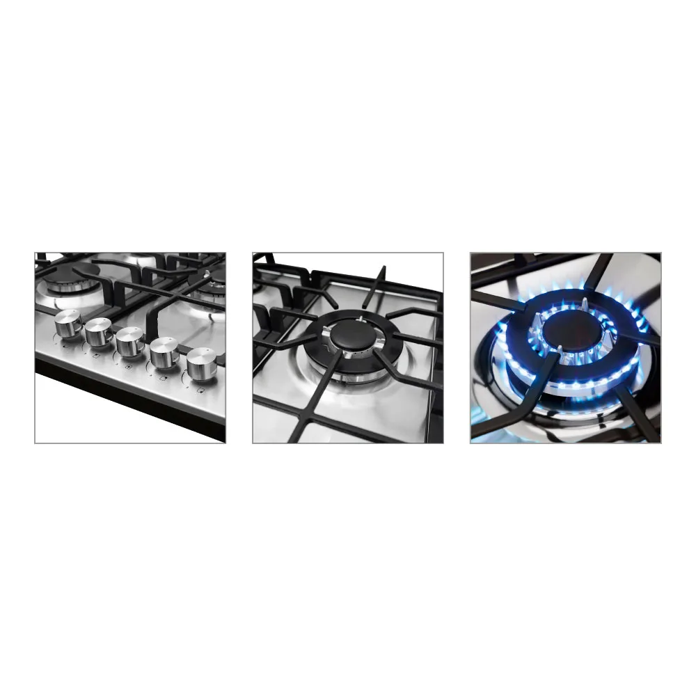 Una encimera de lujo para gas natural y gas licuado, construida en acero inoxidable que combina diseño sofisticado y alto rendimiento. Equipada con quemadores de alta eficiencia, sensor de seguridad (termocupla) en cada quemador que detecta la ausencia de llama y cortar el paso del gas al quemador, comando de tres posiciones (alta, baja y apagado) y parrillas de hierro fundido.