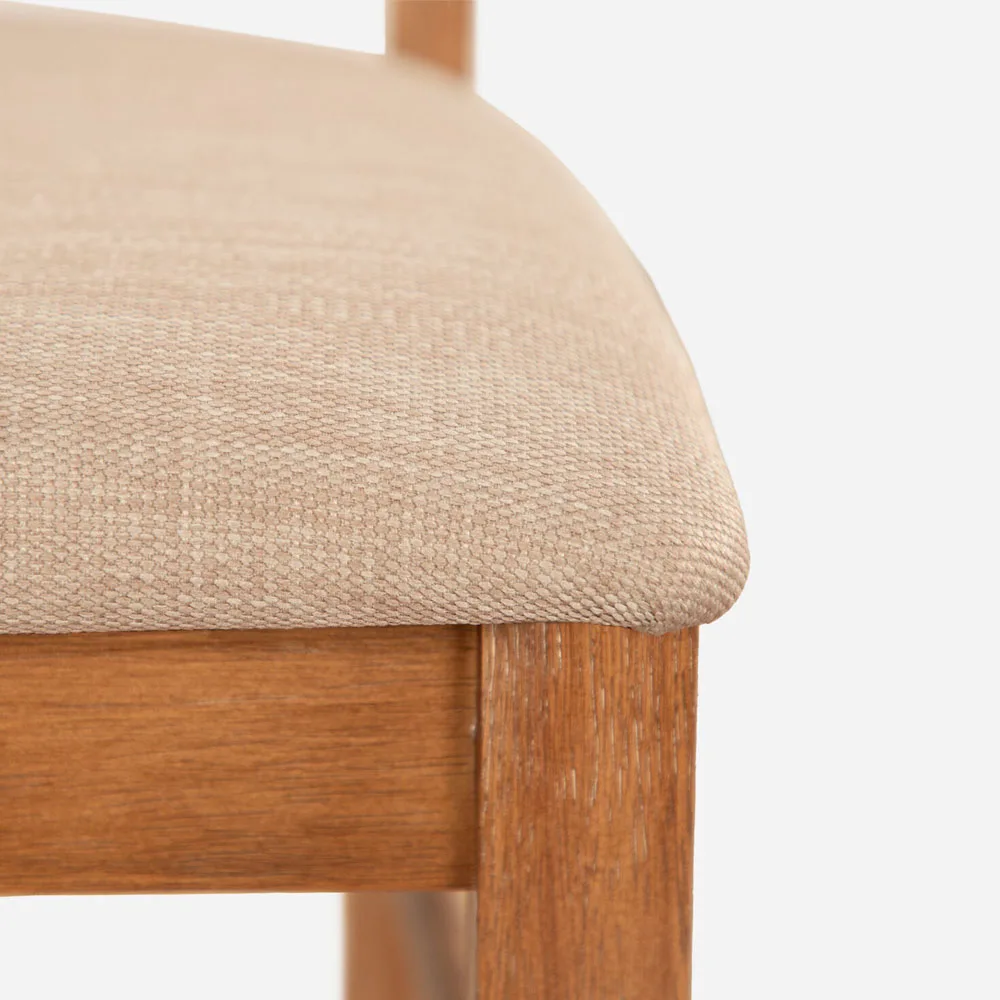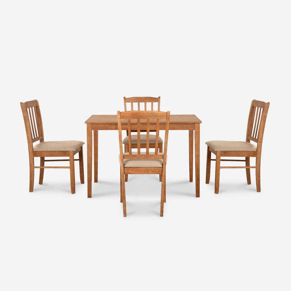 Ideal para espacios reducidos, el set Kansas ofrece diseño cuidado sin sacrificar confort. Su mesa de 113 × 70,5 × 74,9 cm en roble enchapado aporta calidez natural, mientras que las cuatro sillas en rubberwood con tapizado claro incrementan la sensación de amplitud.