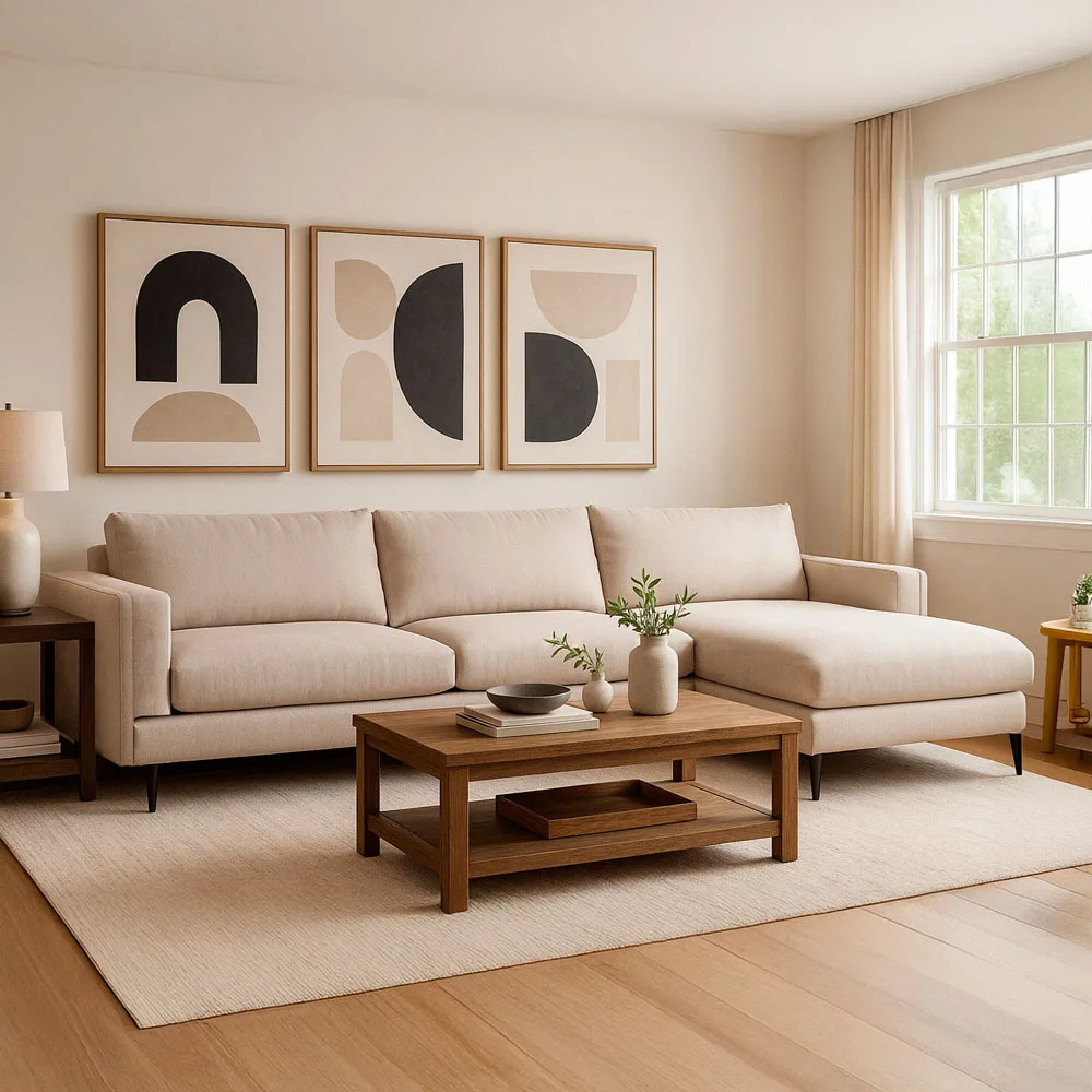 El Sofá Seccional Derecho Beige María Repreve combina diseño contemporáneo y materiales sostenibles en una propuesta cómoda y estilizada. Su tapiz en tono beige claro está fabricado con un 30% de poliéster reciclado, aportando tanto al cuidado del medioambiente como a la estética del hogar.