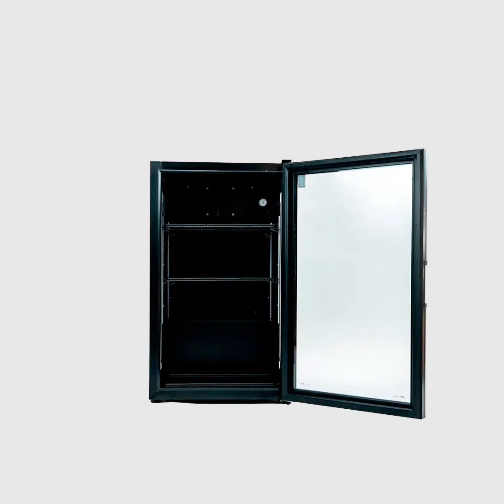 Vitrina vertical compacta con sistema de refrigeración 100% cobre. Su puerta termo panel con gas argón y cierre automático garantiza conservación óptima y fácil operación.